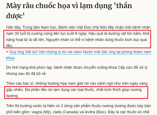 Một số bệnh nhân sau khi dùng thuốc, dương vật cương cứng liên tục nhiều giờ không xìu xuống. Tình trạng này khiến máu ứ đọng, mô dương vật bị thiếu oxy, dẫn đến sưng đau, hoại tử, thậm chí mất hoàn toàn khả năng cương về sau.