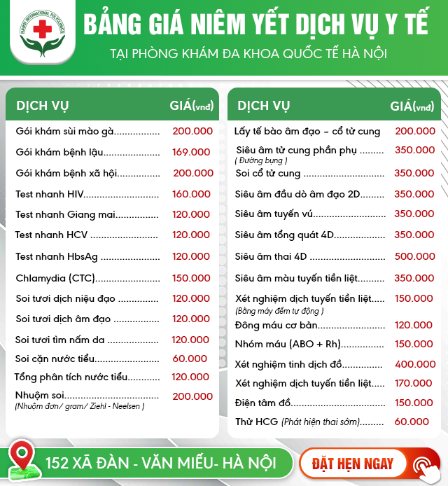 Phòng khám Đa Khoa Đa Khoa Quốc Tế Hà Nội 152 Xã Đàn trực thuộc Bộ Y Tế với chi phí khám chữa bệnh tuân thủ đúng theo quy định của Bộ Y Tế. Đặc biệt, chi phí khám chữa bệnh tại Phòng khám đều được niêm yết công khai theo quy định của Bộ ngay tại sảnh phòng khám giúp người bệnh dễ dàng tham khảo. Chi phí khám sùi mào gà được công khai mình bạch, ưu đãi sùi mào gà chỉ 200K, áp dụng cho những bệnh nhân Đăng Ký Hẹn Khám Trước ưu đãi 200K trên website ( giá gốc 1.230.000đ)TẠI ĐÂY!