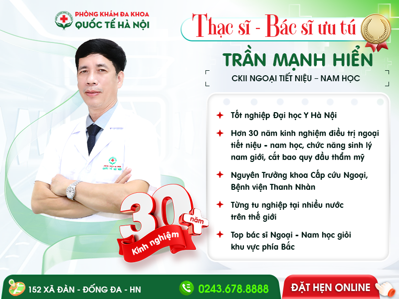 • Bác sĩ chuyên khoa Trần Mạnh Hiển: Bác sĩ CKII Ngoại khoa với hơn 30 năm kinh nghiệm, từng giữ chức vụ Trưởng khoa Ngoại cấp cứu bệnh viện Thanh Nhàn. Vinh dự đạt Top 5 bác sĩ xuất sắc trong điều trị bệnh xã hội tại Hà Nội nhiều năm liên tiếp.