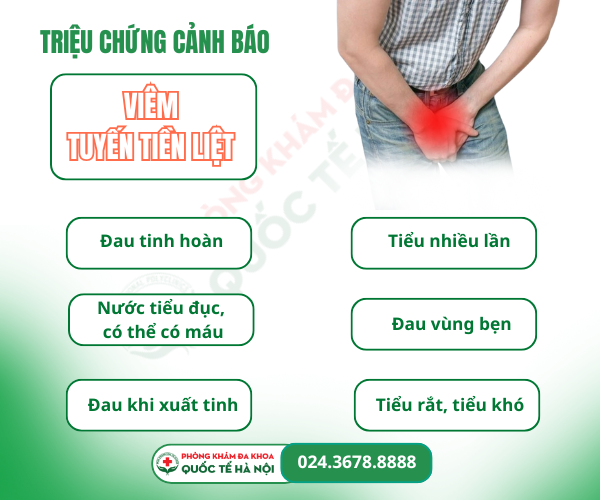 Đau tinh hoàn, đau vùng bẹn, tiểu nhiều lần, nước tiểu đục,…là những triệu chứng hay gặp của bệnh viêm tuyến tiền liệt mãn tính. Bệnh thường xuất hiện sau nhiễm trùng ngược dòng của viêm niệu đạo, viêm mào tinh hoàn, viêm tinh hoàn.