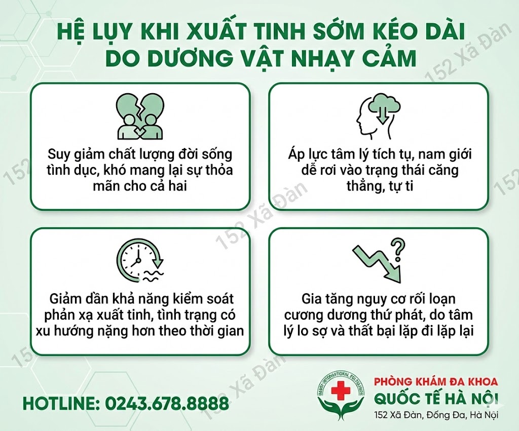 Tuy nhiên, điều đáng lo ngại là: tình trạng này hiếm khi tự khỏi, đặc biệt khi nguyên nhân đến từ độ nhạy cảm bất thường của dương vật. Nếu không được nhận diện và can thiệp đúng hướng, xuất tinh sớm rất dễ kéo dài dai dẳng và để lại nhiều hệ lụy: