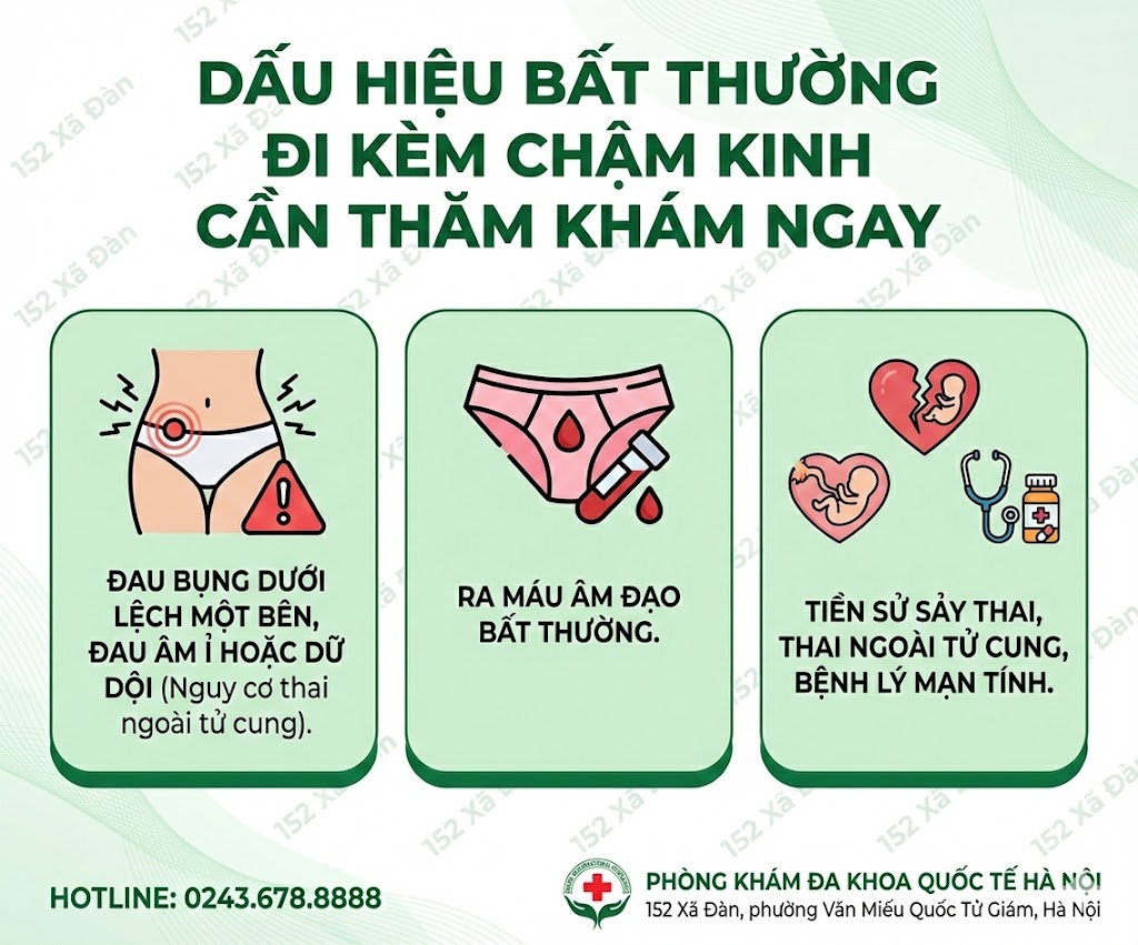 → Bác sĩ khuyến nghị: Nếu không xuất hiện các dấu hiệu bất thường kèm theo dưới đây, chị em không cần khám ngay khi chỉ mới trễ 1–2 ngày.