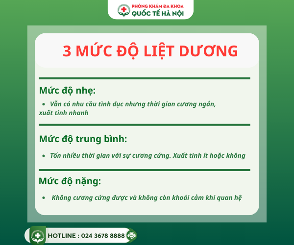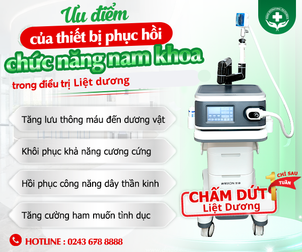 Liệt dương không phải là dấu chấm hết cho đời sống sinh lý nam, nhưng sẽ trở thành vấn đề nghiêm trọng nếu chủ quan, điều trị sai cách hoặc trì hoãn thăm khám. Trên thực tế, đa số các trường hợp liệt dương đều có thể cải thiện tích cực khi được chẩn đoán đúng nguyên nhân và áp dụng phương pháp điều trị phù hợp. Liên hệ ngay tới Hotline 024.3678.8888 hoặc nhấp chọn TƯ VẤN ONLINE để được hỗ trợ tư vấn.