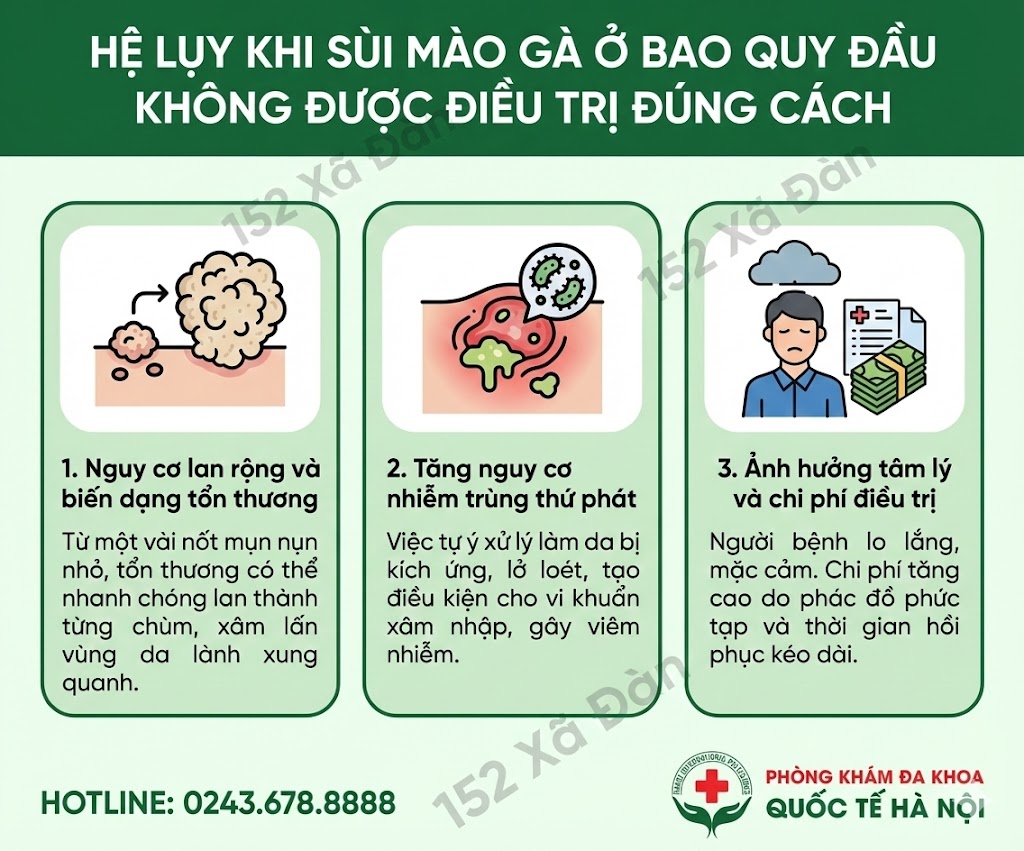 → Trường hợp của anh H. chỉ là 1 trong số rất nhiều bệnh nhân có thói quen tự điều trị tại nhà hoặc trì hoãn thăm khám sùi mào gà khiến bệnh trở nặng. Ngoài ra, bác sĩ CKII Lê Đỗ Nguyên cũng cảnh báo sùi mào gà khi không được điều trị đúng cách, đúng thời điểm có thể để lại hàng loạt hệ lụy như: