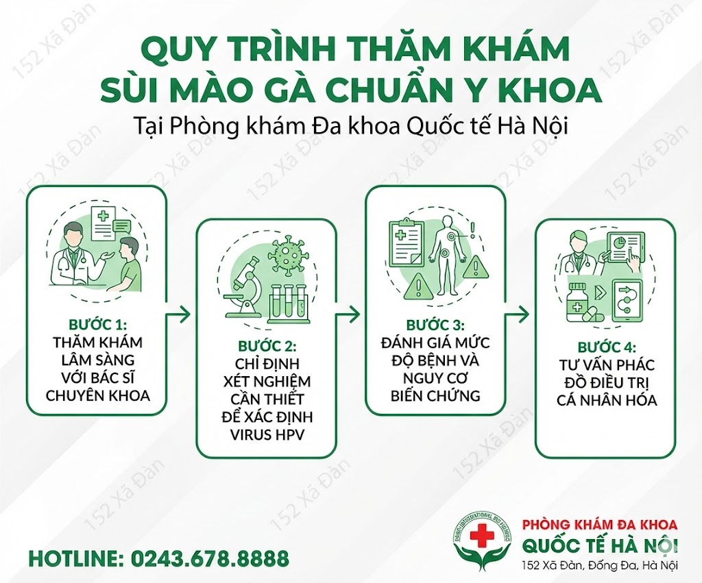 Tại các cơ sở y tế chuyên khoa, quy trình chẩn đoán sùi mào gà chuẩn y khoa thường bao gồm các bước sau: