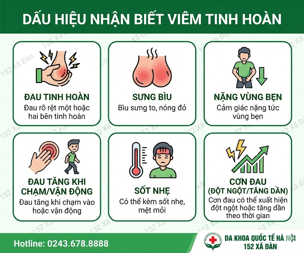 Dấu hiệu nhận biết viêm tinh hoàn thường khá rõ ràng khi có thể gây đau rõ rệt ở cả 1 hoặc 2 bên tinh hoàn kèm theo sưng bìu, đau rát, căng tức vùng bẹn và đôi khi có thể kèm theo sốt nhẹ, mệt mỏi.