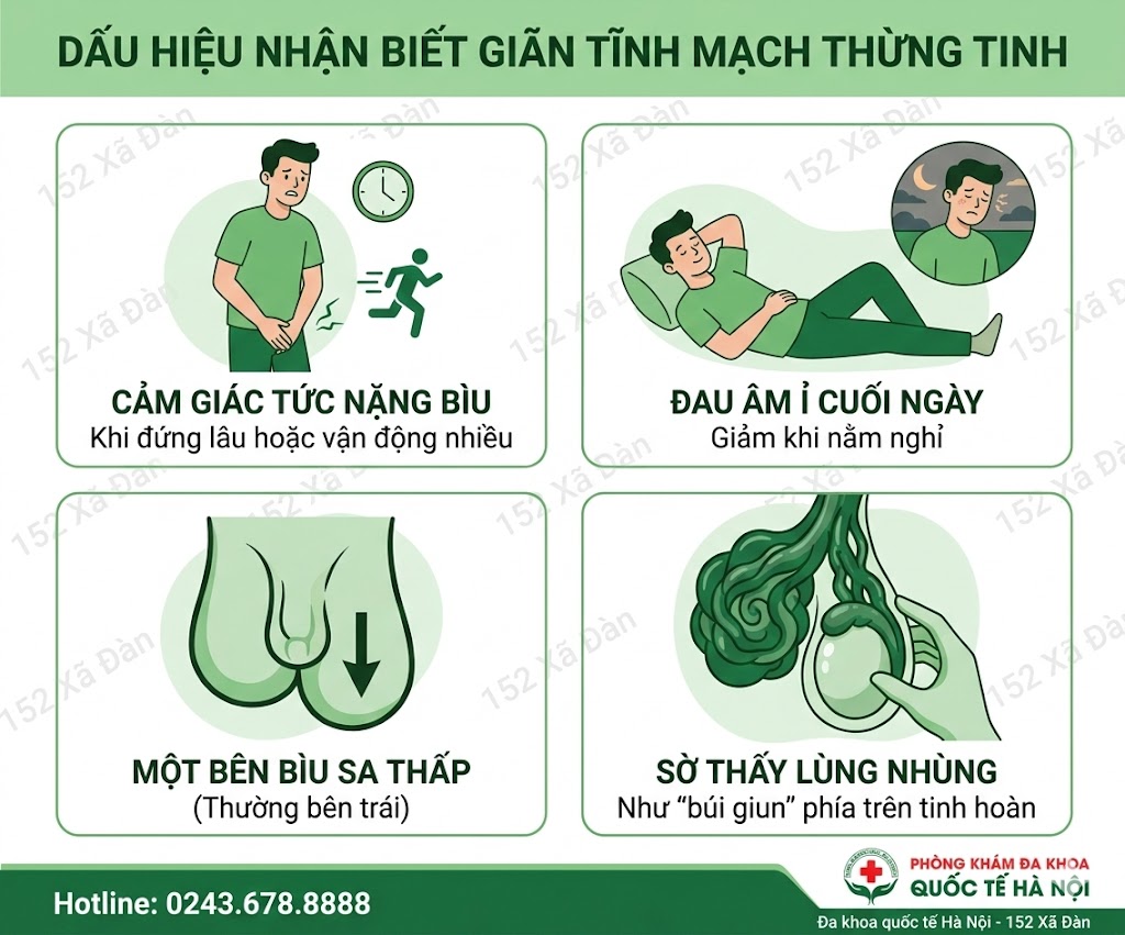 Ngoài sưng cục ở tinh hoàn, giãn tĩnh mạch thừng tinh còn gây các triệu chứng như: tức nặng bìu, đau âm ỉ vào cuối ngày, một bên bìu sa thấp hơn kèm theo cảm giác lùng nhùng như “búi giun” phía trên tinh hoàn khi sờ vào
