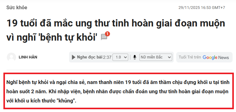 Ung thư tinh hoàn là một trong những bệnh ung thư hiếm gặp nhưng lại phổ biến nhất ở nam giới trẻ (15–40 tuổi). Điều đáng lo ngại là bệnh thường khởi phát âm thầm, không đau, không sốt – khiến nhiều người chủ quan bỏ qua “tín hiệu đầu tiên” từ cơ thể.